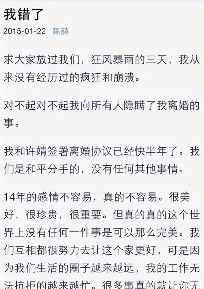 指责与谩骂,铺天盖地席卷了陈赫和张子萱。在被舆论骂了三天后,陈赫发文道歉。并表示自己和许婧已经离婚半年了……